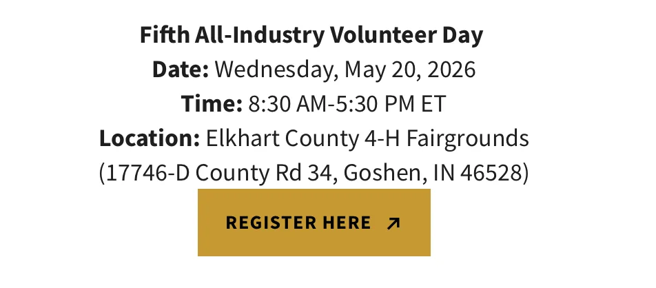 The RV Industry Association's Sustainability Committee is hosting the fifth annual All-Industry Volunteer Day on Wed., May 20, at the Elkhart County 4-H Fairgrounds. Volunteers from all sectors of the industry will come together to participate in restoration and enhancement projects for the fairground's recreation and campground facilities. This event is a great opportunity for the RV industry to demonstrate its commitment to sustainability and community development.